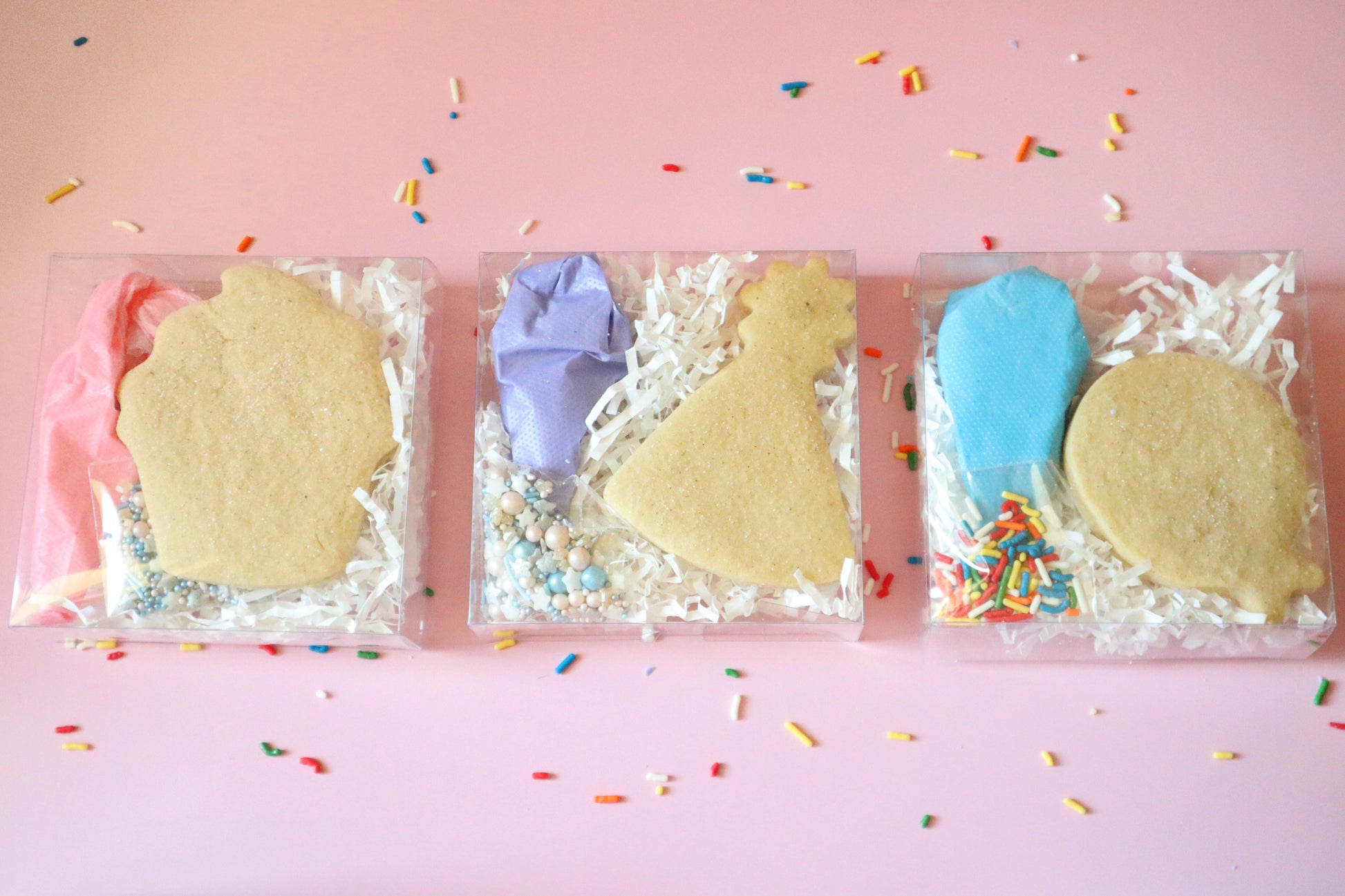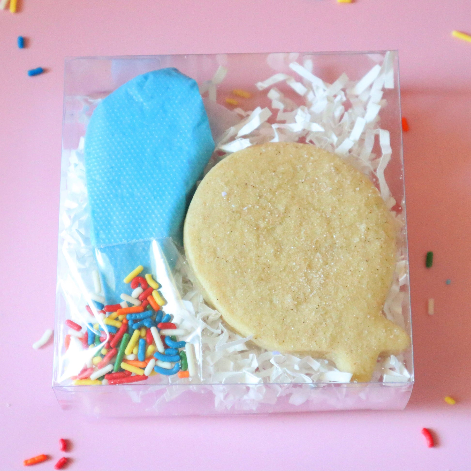 Send your party guests home with something special or have these as a fun treat at your next event. Each cookie kit comes with a 3" cookie, 1 royal icing bag and sprinkles, beautifully packed in a transparent box and crinkle cut paper.