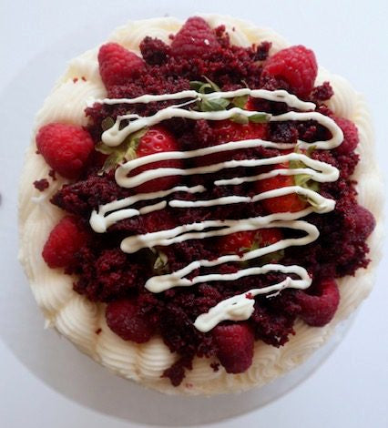 A fluffy, velvety cake with vanilla buttercream or cream cheese frosting. Fresh berries optional